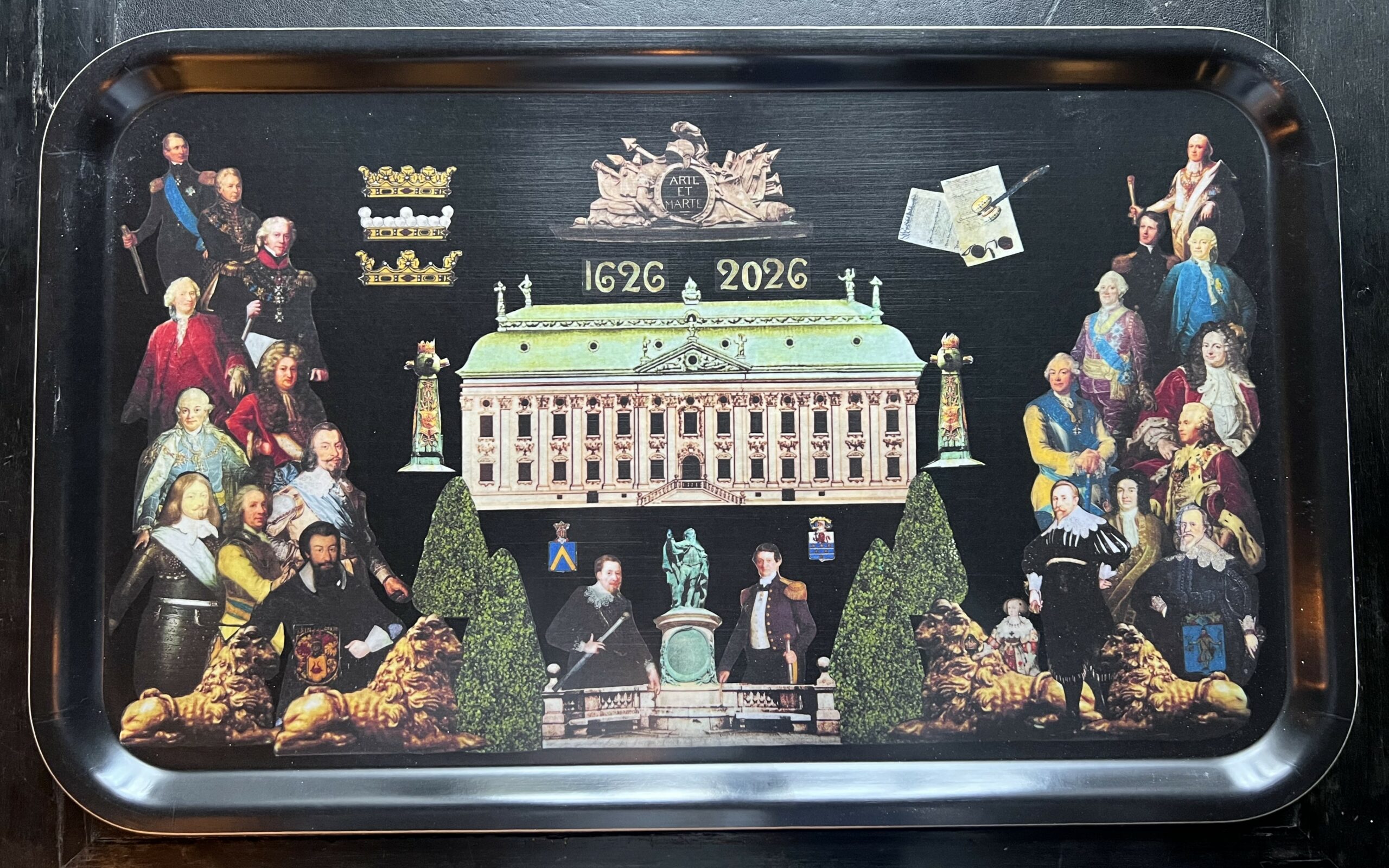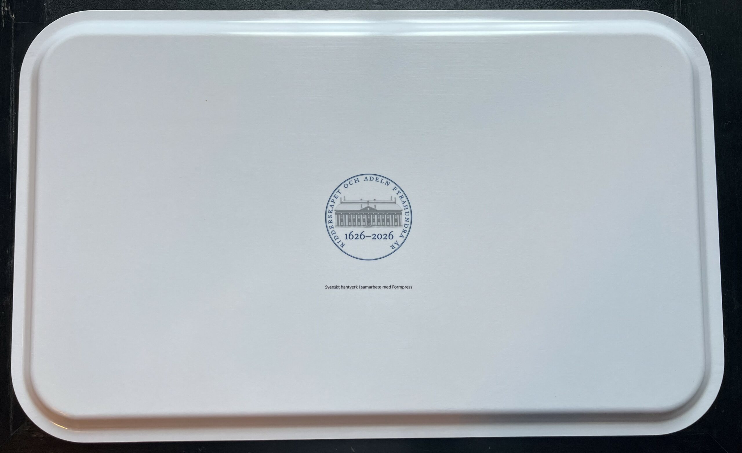 Rektangulär bricka med motiv av Riddarhuset omgivet av för Riddarhuset betydelsefulla personer under 1600-1800-talet, däribland kung Gustaf II Adolf, Axel Oxenstierna och ett urval av lantmarskalkar.