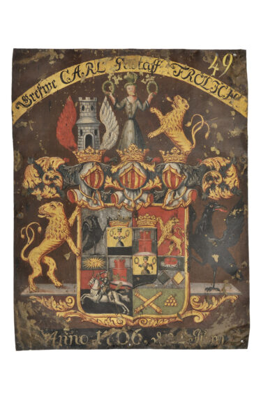 Carl Gustaf Frölich hade tidigare, år 1700, blivit friherre, men utan att ta introduktion, och hur det friherrliga vapnet sett ur är inte känt. Fälten i grevevapnets huvudsköld är de följande: 1) En svart örn i ett fält av silver, Örnen, som är vänd åt sinister* och tillbakaseende*, har vingarna lyftade. 2) Ett tillbakaseende lejon i ett rött fält. Notera att örnen och lejonet – trots sin placering inuti skölden – med vänster framfot respektive ramarna fungerar som sköldhållare till hjärtsköldens fält 1 och 2, vilka originellt nog har en friherrlig krona respektive en grevlig. 3) En ryttare till häst i ett fält delat* i rött och svart. 4) Ett fält delat i silver och grönt. I den silverne delen en grön fana* korslagd* med en fana av guld; i den gröna två korslagda kanoner och en travekanonkulor, allt av guld. En speciell lösning är att en (smal) bjälke* som ska vara blå är lagd över huvudskölden. Idén fick flera efterföljare under de kommande åren. På ena sidan är bjälken belagd med en sol av guld, på den andra med en riksrådshatt.